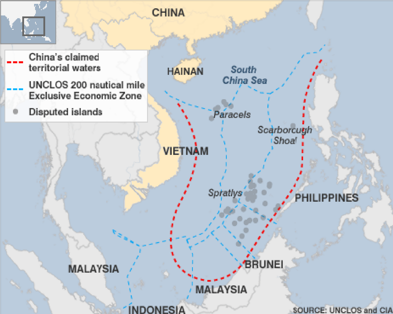 China's claim to the various islands and reefs under dispute is based on the "nine-dash line", which maps out the Chinese trade route into South East Asia. Many have argued that the islands China claims under the nine-dash line are closer to Vietnamese or Philippine territory, and should therefore be sectioned off in accordance with the UNCLOS 200-mile line, a ruling which Beijing itself helped to ratify. However, China would not be the first large nation to lay claim to islands far from its own shores, at the expense of weaker, less developed countries. British authority over the oil-rich waters of the Falkland Islands was reinforced by Washington's decision not to support the Argentine claim to the islands, which lie just off their eastern coast. Guam and Hawaii are hundreds of miles from America's coast, and yet still considered part of the United States without dispute. Australia's Christmas Island is closer to Indonesia than any part of the Australian landmass.